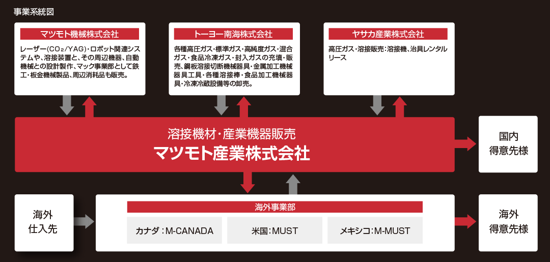 産業界の発展をあらゆる面から支えるため、商品の販売を担うマツモト産業を中心に、国内・国外のグループ各社と密に連携を取りながら、対応してまいります。