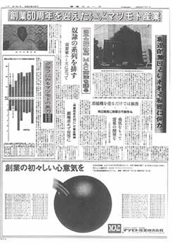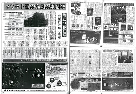 「マツモト産業 創業90周年」を大特集する業界紙の紙面。